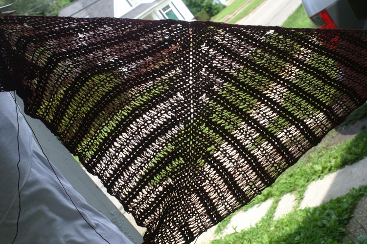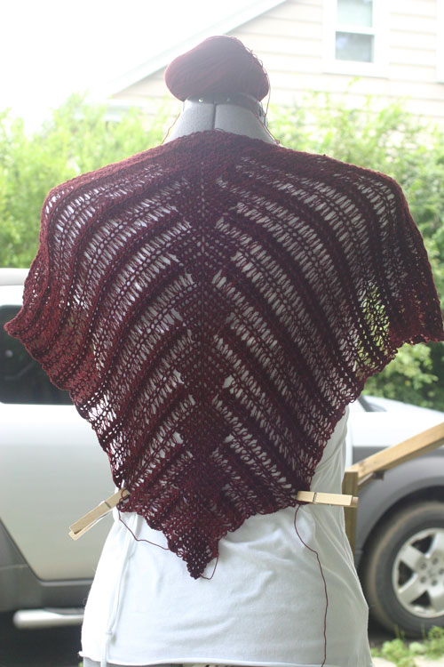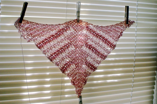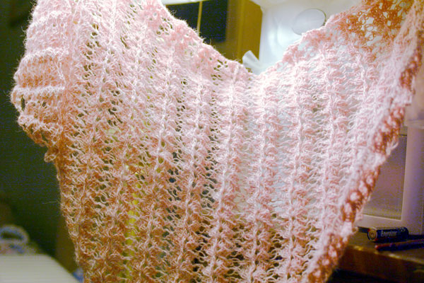 I also had a photo up against the miniblinds in my kitchen. This one at least showed a bit more detail. But still, nowhere near the vision I had. It was still all crinkled up. Since the photo was only for my own benefit, I never bothered to smooth out the progression of the shawl, or “what could be.”