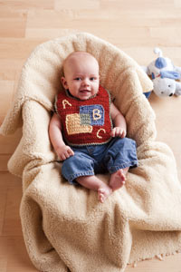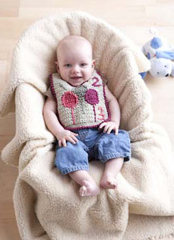 Isn’t this baby just a little ham?? They could not have picked a happier baby! These bibs were a blast to design, especially since I was working them up in Mission Falls 1824 Cotton. I had never worked with that yarn before, and lately I have been on a huge cotton kick.